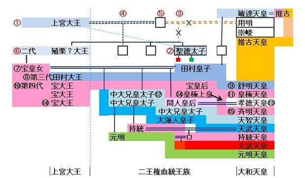 これは上宮大王の夢「倭国内ニニギ系王族として、先祖の応神天皇・継体天皇のように大和王統が乱れた時は大和天皇を継いで大和王権を再興する」、の実現でもあったのです。聖徳太子の夭折や、二代大王に皇子がいなかったなどで、女系(宝皇女・皇極・斉明)によるしか無かったのは満点では無かったかもしれませんが。女系はそれをよく認識して期待に応えようとした、と筆者は推測します。