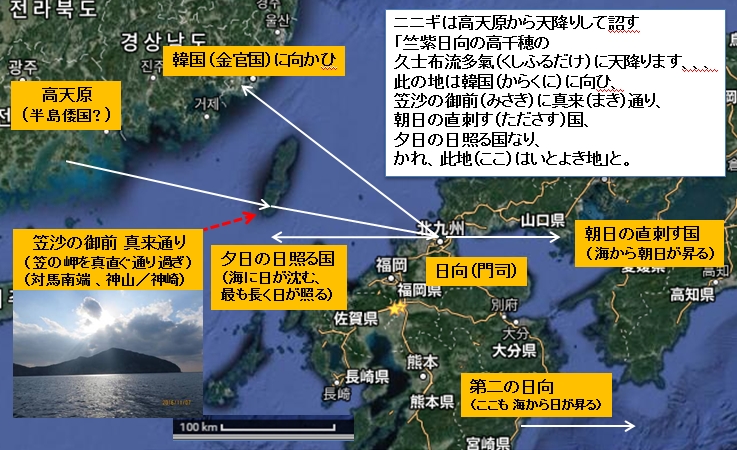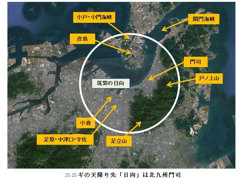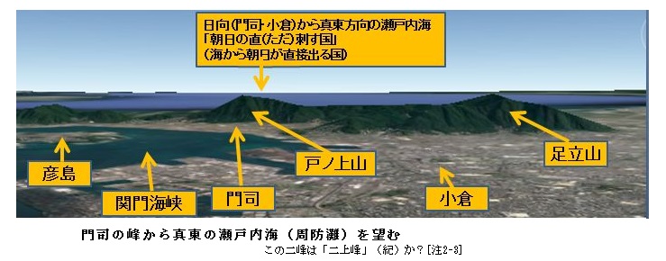 (3) ニニギはしかし「神」とされるから「大君(おほきみ)」ではない。それに対し、神武は東征の後大和諸国を治める大君となった。東征の前にも宮(朝廷、彦島域の吉備・安芸)があった。だから「大君の遠(とほ)の朝廷(みかど)」とは、「神武大君の大和から遠い彦島の朝廷」である。神武が「蜻蛉(あきつ)のトナメ」と歌った彦島であろう(第三章)。そこは神武から高天原につながる神代への入口である。